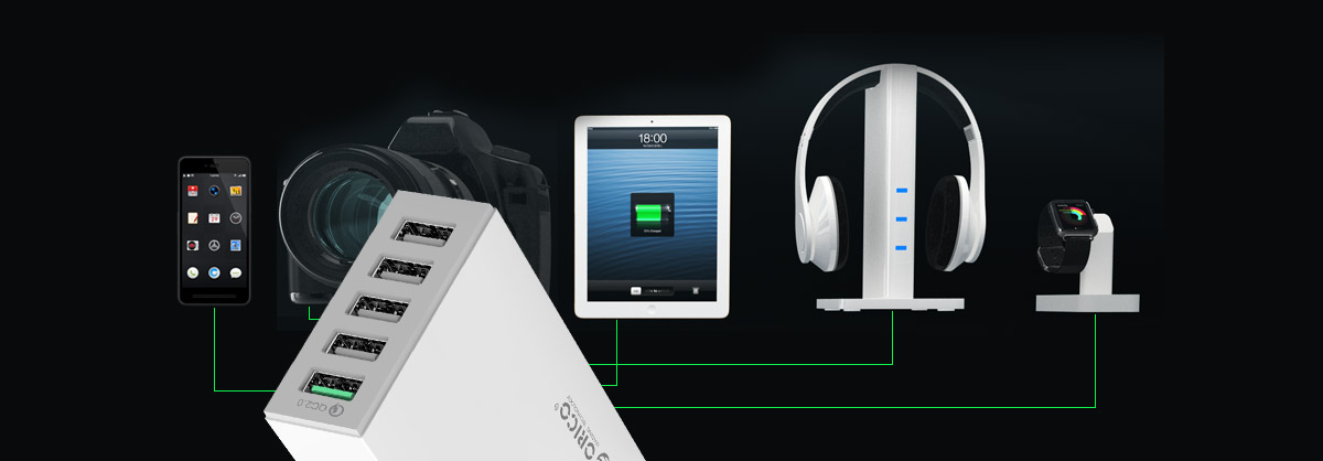 為了實現更智能的充電操作,ORICO QSL-5U采用電流控制和管理模式,配備USB智能充電芯片,可自動識別充電設備,智能匹配適合充電方案,平板、手機、移動電源、Ipod、MP4等各種5V設備,Supercharge口都可以自動偵測,給予設備更快的充電電流。