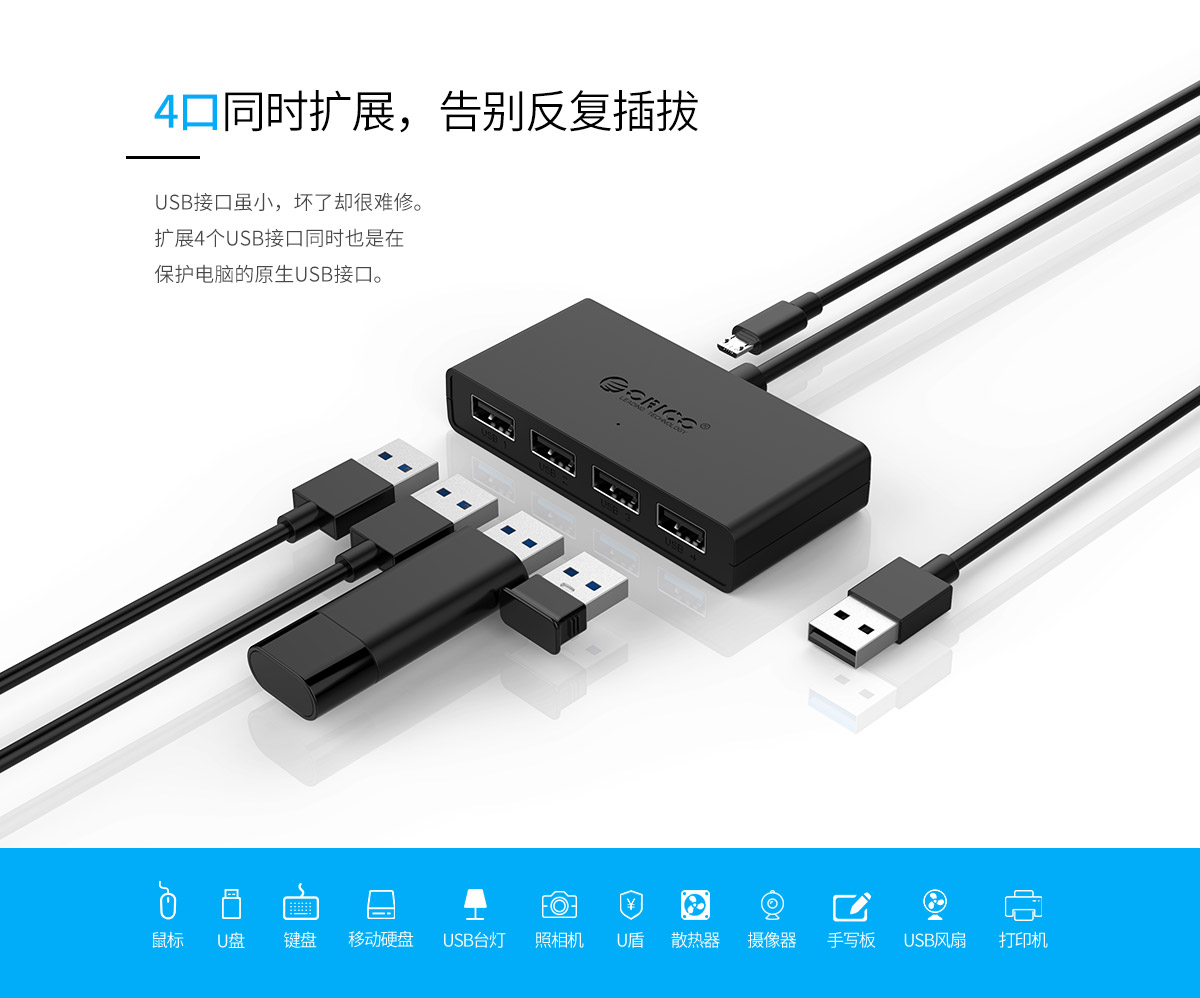 連體設計 多線長可選 藍色LED指示燈 多口集線器