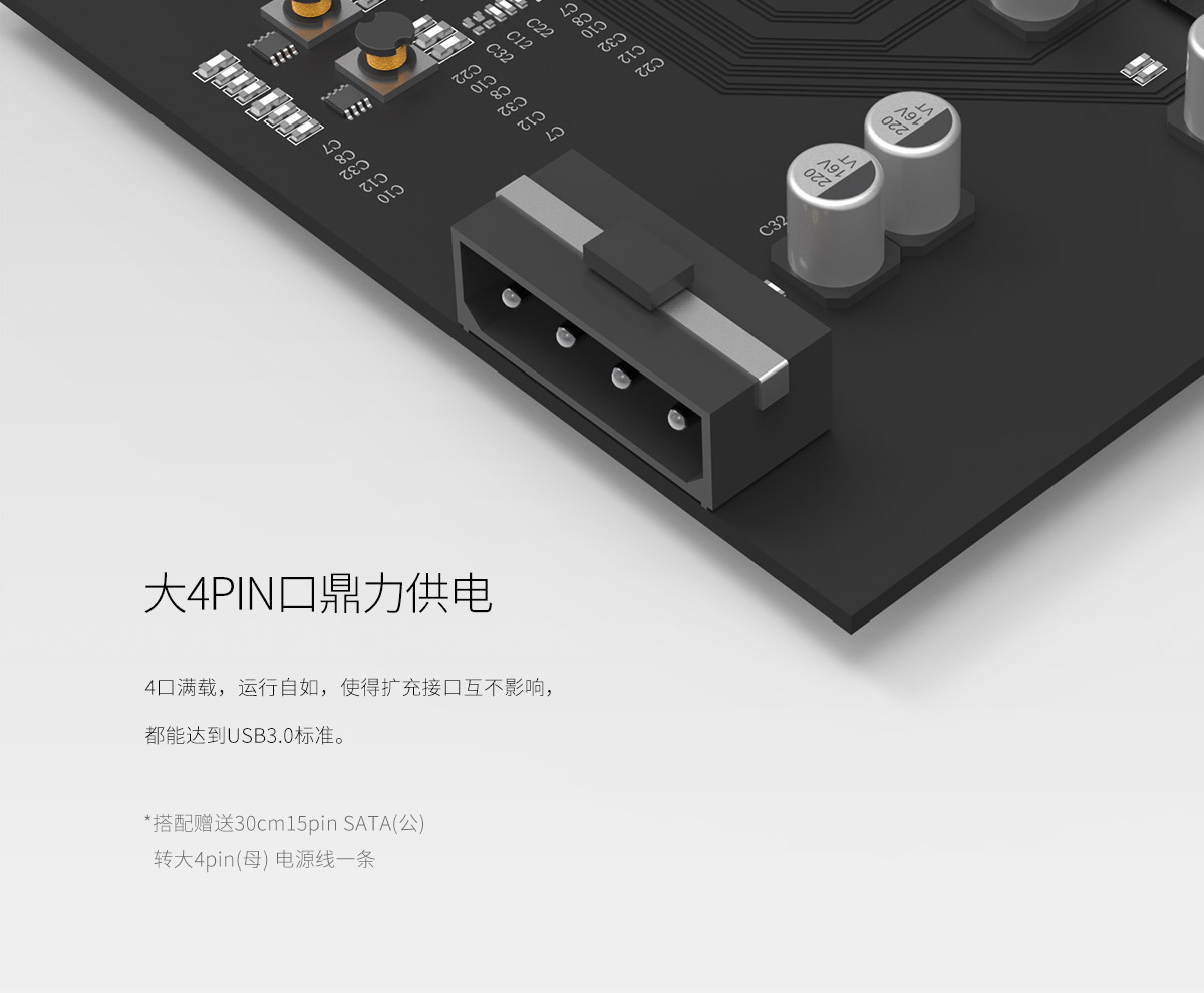 4口USB3.0 PCI-E擴(kuò)展卡,帶4PIN供電口